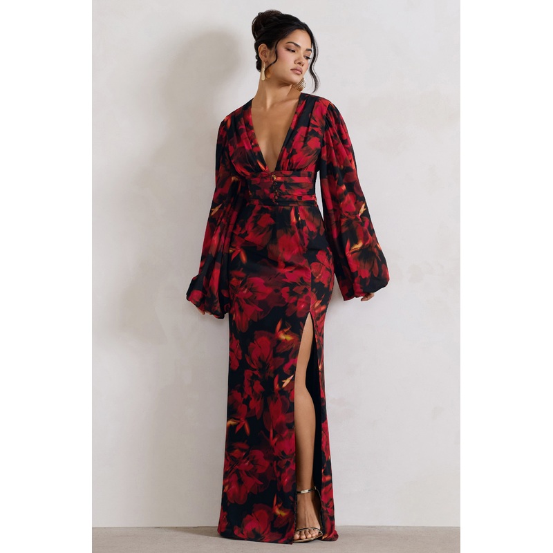 Casarile | Red Floral Print V-Neck Balloon Sleeve Maxi Dress
