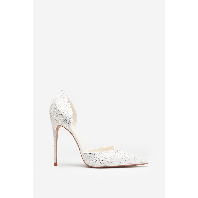 Elevate your evening looks with a pair of premium ivory pumps. Catching lights wherever you walk with a showering of crystal diamants, its easy to see why these pointed court shoes were given the name Catcher. 4.3 inch stiletto heels and exposed arches mak