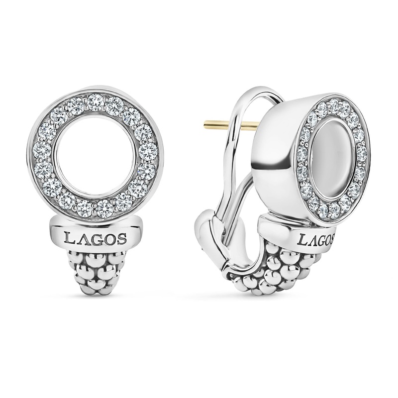 Diamond circle Caviar beaded earrings finished with an omega back. diamonds are the highest quality natural stones.