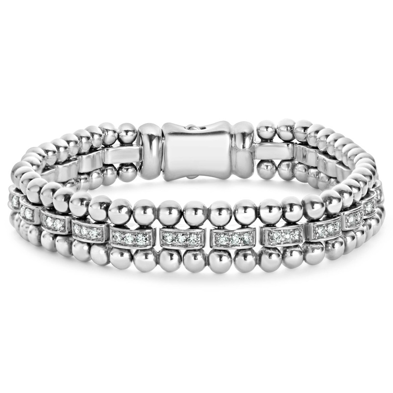 Diamond stations accented by sterling silver Caviar beading form this classic link bracelet. diamonds are the highest quality natural stones.