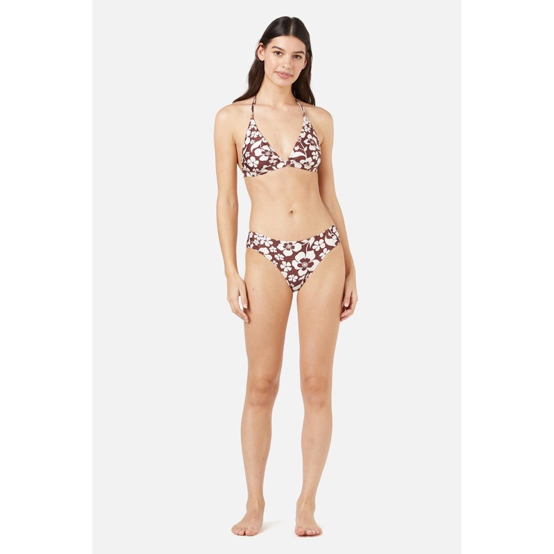 Chocolate & cream retro floral printed bikini bottom- fully lined inner- low rise bikini brief- full rear coverage- ruched side detail- pair with the Cecelia tri bikini top- nylon elastane blend swim fabric- available in chocolate"Product Code: PGFY568