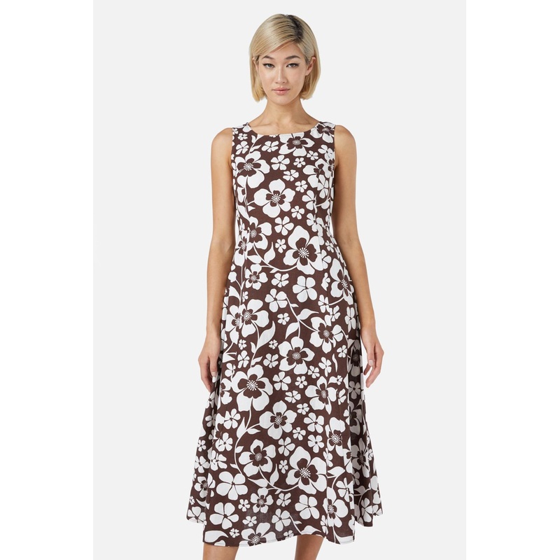 A fresh & summery retro style midi dress in a chocolate & cream tonal flower print- sleeveless style - midi length, a-line fit - invisible back zipper - adjustable side ties for a more cinched look - made of a viscose linen blend - available in chocolatePr