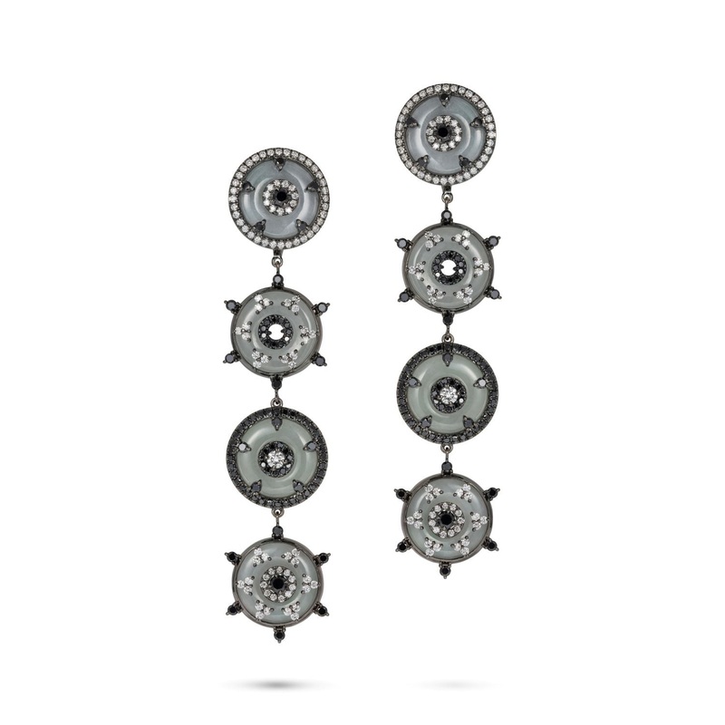 TheCeleste Black Diamond and Jade Disc Earrings areset in 18ct black gold. They feature 12mm jade discs, white round cut diamonds, and are decorated with 168 black diamonds.Part of the Celeste collection by Nadine Aysoy.
