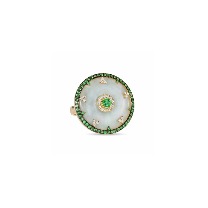 The Celeste Tsavorite and Jade Disc Ring is set in 18ct yellow gold. It features a 22mm jade disc, white round cut diamonds, and is decorated with 56Tsavorites.Part of the Celeste collection by Nadine Aysoy.
