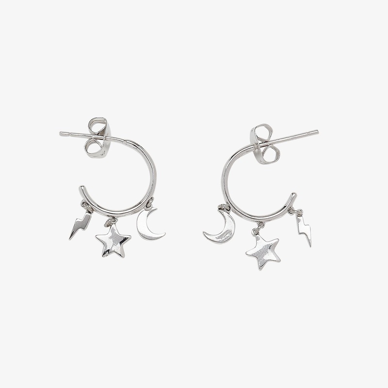 You should thank your lucky stars for our Celestial Charms Huggies. These suuuuper-stellar hoops come in a shimmering silver finish, with three dainty, dangling charms that sparkle and shine.