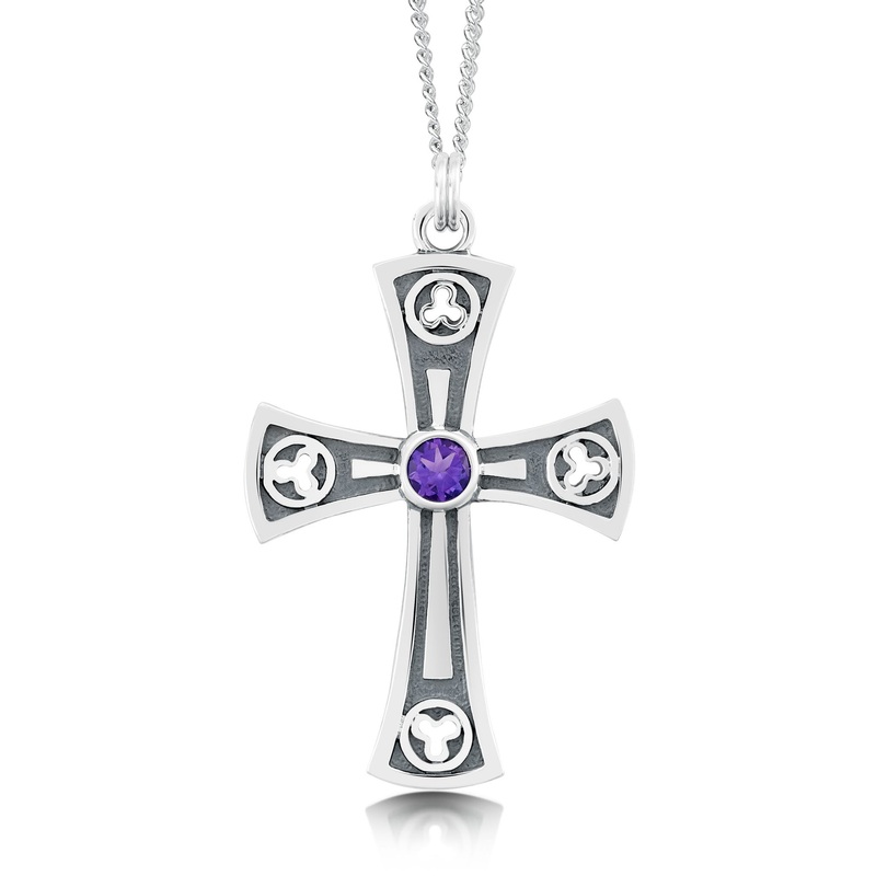 This Celtic Trinity Cross Pendant features four stylised Celtic symbols on a stunning oxidised sterling silver design, complemented by a beautiful amethyst. The piece hangs on a silver curb chain.Sheilas Celtic Trinity collection is based on the triquetrao
