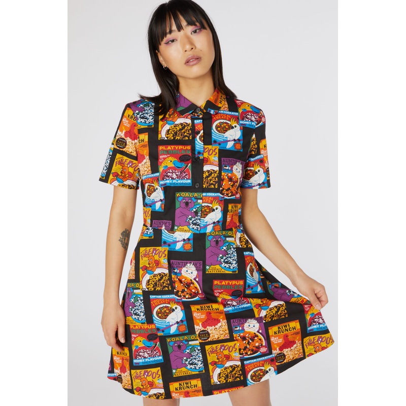 Printed Shirt Dress- Front Button Opening- Side skirt pockets - A-line shaped skirt - Made of cotton poplin - In a nostalgic cereal box print- Available In blackProduct Code: DGFS299305