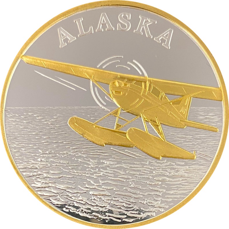 This medallion is available in 1 oz single gold relief (24k plating on the front part of the silver coin) The 1 oz medallion is similar in size to a silver dollar. They are packaged in an airtight container and handsome gift box. The reverse is our Land of the Midnight Sun design.