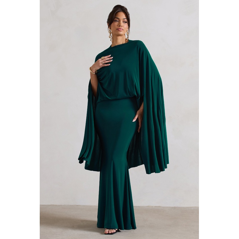 Wedding season calls for an elegant addition likeCharmaine. Crafted in a classic bottle green shade of our signature stretch jersey, this maxi is defined by an extravagant cape detail and demure high neckline. Flourished with some sparkling stilettos likeO