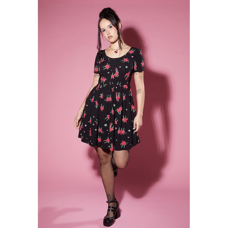 Graphic Dress-Artwork Collaboration With Artist Shn Primrose-Short Sleeves-Round Neckline-Zip Closure At Back-Fit-And-Flare Shape-Pockets At Sides-Relaxed Fit-Made From Soft Woven Viscose-Available In BlackProduct Code: BGFX059
