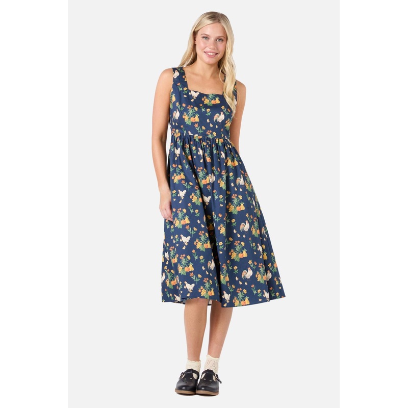 Sleeveless midi dress featuring a vintage style print of sweet chickens and garden patch veggies- square neckline- sleeveless style- gathered skirt- length finishes mid calf- inivisible zipper at back- side ties to cinch in at waist- made of a soft cotton