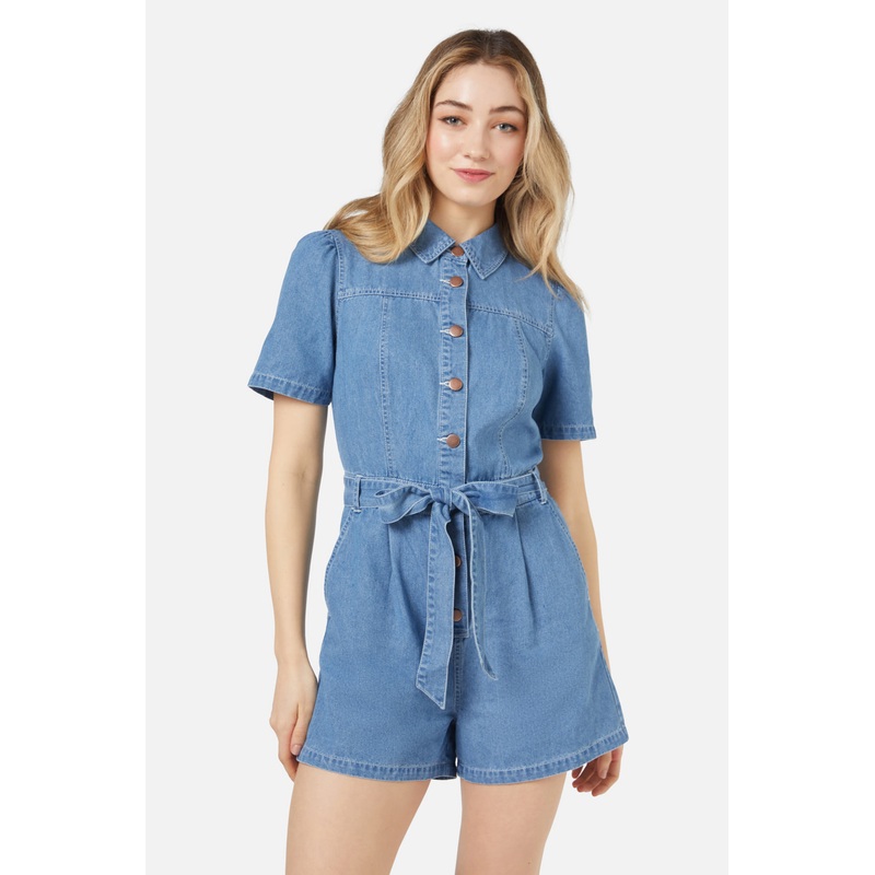 Light denim romper with a button down front & short sleeves, a classic collar and tie front for a retro 70's vibe - classic pointed collar - shank style button at centre front - detachable waist tie - handy side and back pocket - made from a comfy lightwei