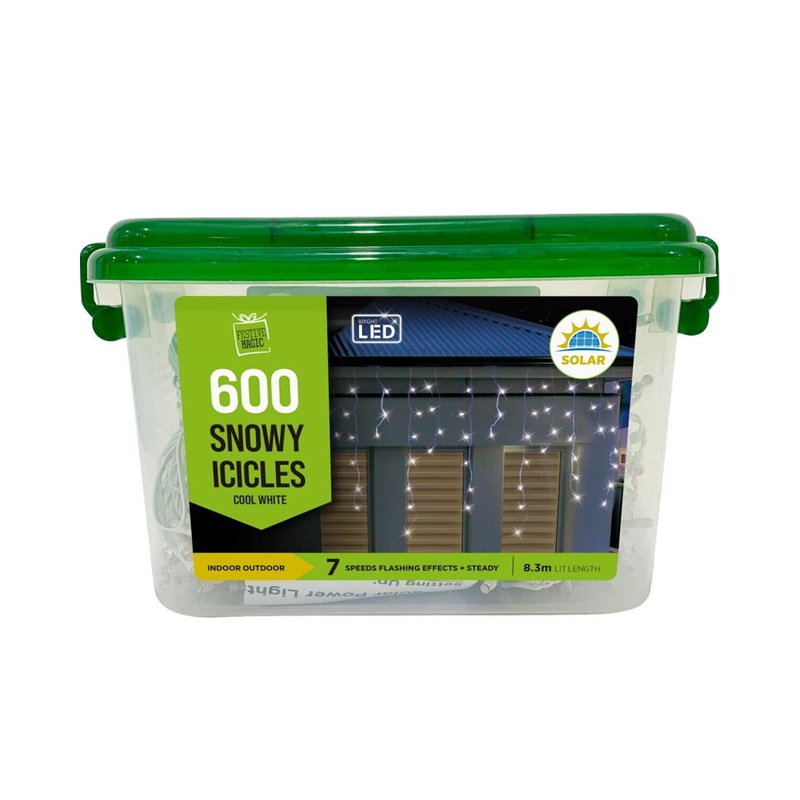 Item Includes:600x Solar lights.Sizing:Measures 8.3m / 26ft lit length.Christmas starry night.Create a snowy effect and hang this Solar Snowing Icicles 600 White 8.3m around and inside your home. This decoration features 600 white twinkling LED lights atta
