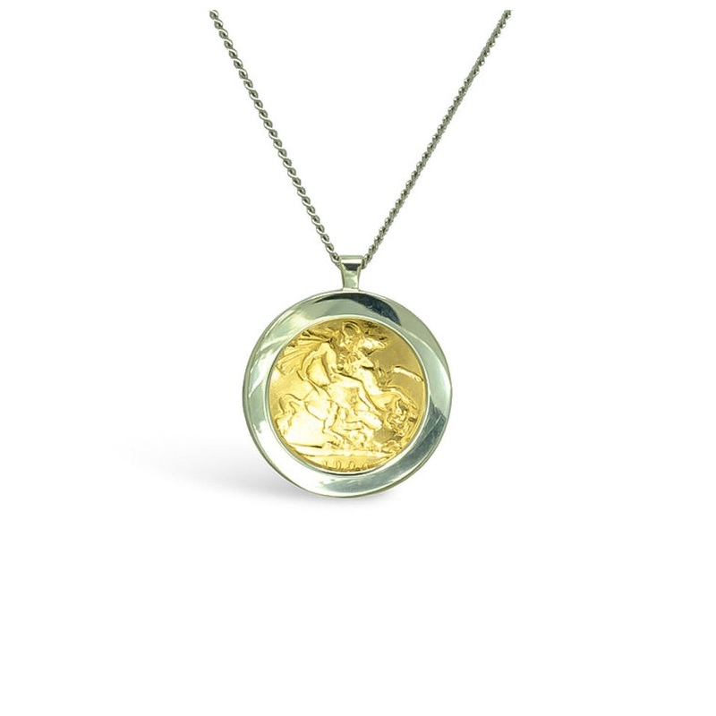 - Sleek Design: This Chunky White Gold Sovereign Mount Pendant features a sleek and modern coin mount, in white gold, designed to beautifully frame and enhance the appearance of your gold sovereign or other coin.