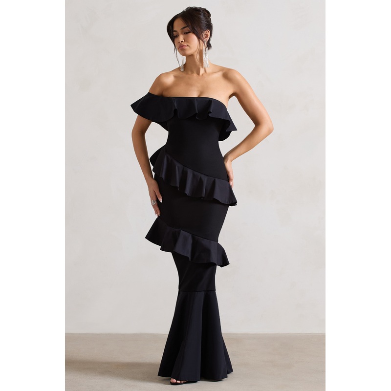 Prepare for all eyes to be on you in our aptly-named black maxi dress Cinematic. Boasting an elegant bardot neckline, this bodycon features a figure hugging bodice that flares into a flattering fishtail skirt. The dress has carefully placed ruffles that enhance your curves adding an element of romance. To be the star of the show at your upcoming event, try styling Cinematic with a sleek bun and our Sweet Step heels.