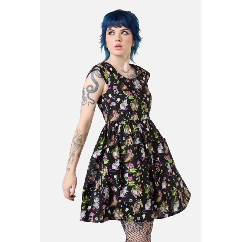 Graphic Dress- Cap Sleeves- Fit-And-Flare Shape- Button-Down Closure At Front- Pockets On Skirt- All-Over 'Collectors Guild' Print- Artwork by Amanda Toner- Made From Woven Cotton- Available In BlackProduct Code: DGFZ160