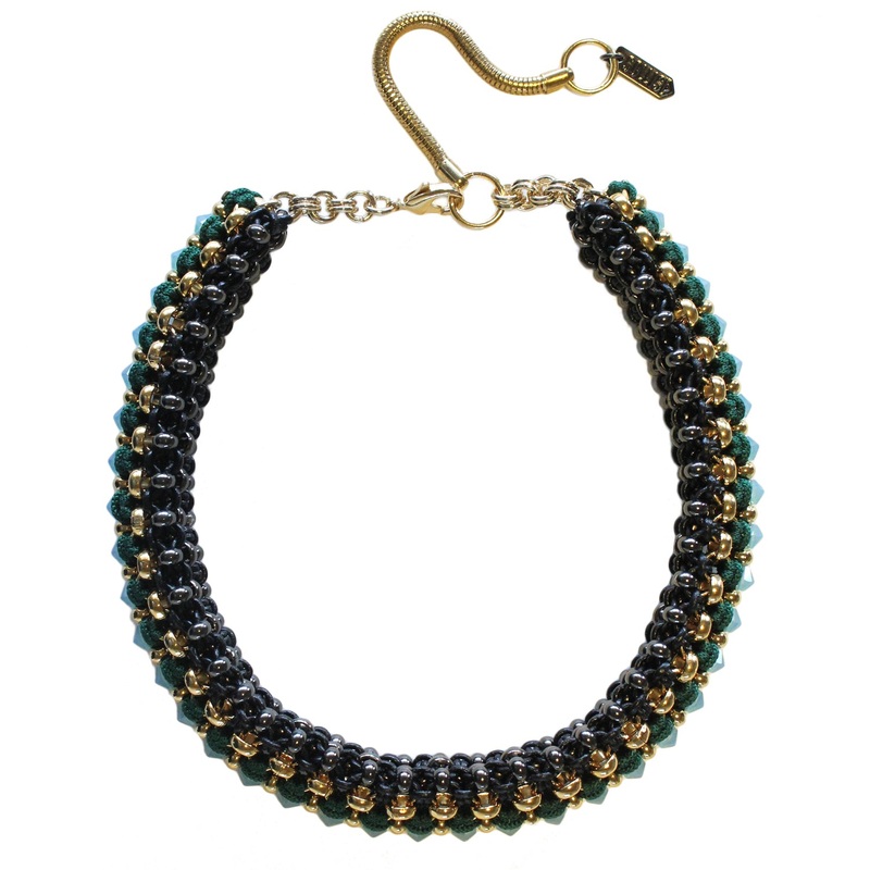 The stylish Congo Necklace in Green from Sollis Jewellery uses a combination of gold and gunmetal plated brass chain. Hand crafted using leather and viscose cords with Swarovski crystals, this is a beautiful necklace which effortlessly fuses tribal and mod