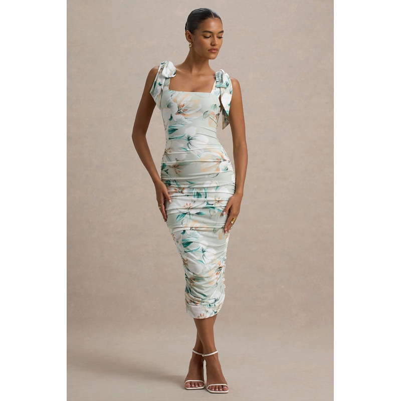 Cordelia | Green Floral Print Bodycon Midi Dress With Bow Straps