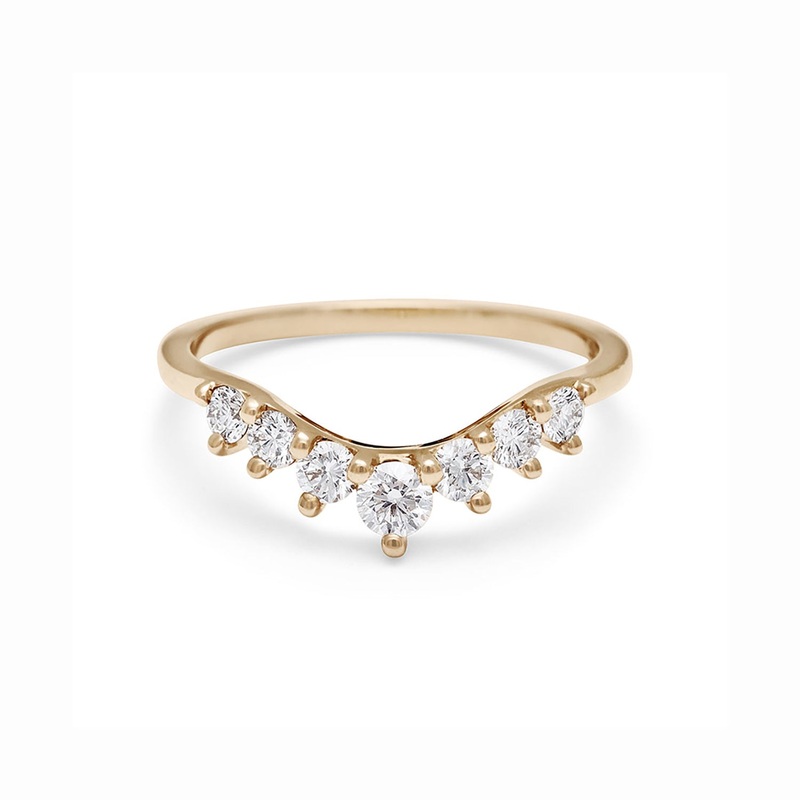 TheCosmic Tiara Curve Band - White Diamonds is made in New York City fromrecycled 14k yellow gold.the celestially inspired rings subtle curve is composed of seven supersized, round conflict-free white diamondsa delightful dose of sparkle worn singly, neste