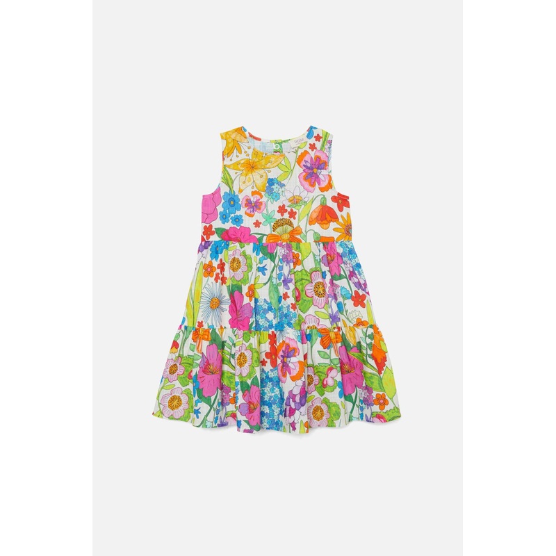 Printed textured cotton dress– soft organic cotton textured quality – sleeveless styling – easy snap back opening– round neckline – soft gathering through panels– exclusive princess highway print