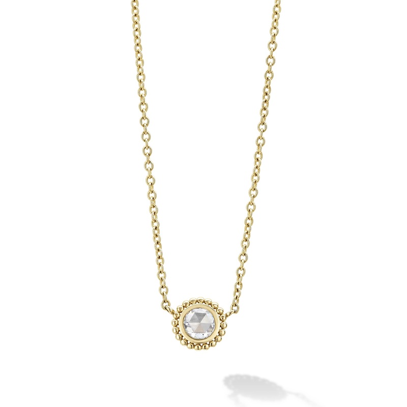Rose cut diamond pendant necklace set and surrounded by 18K gold Caviar beading. diamonds are the highest quality natural stones.