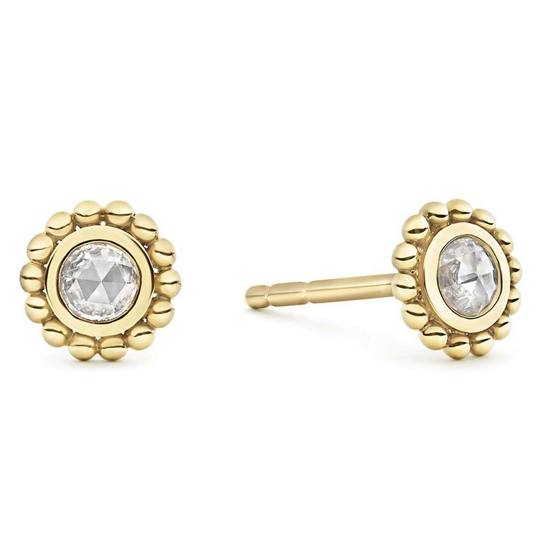Rose cut diamond stud earrings set and surrounded by 18K gold Caviar beading. diamonds are the highest quality natural stones.