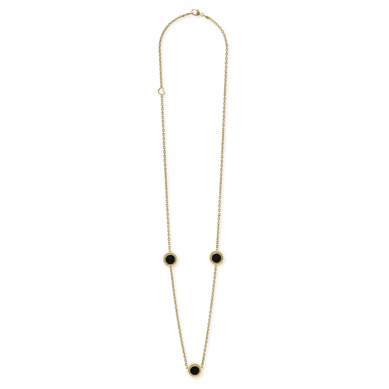 Three round onyx stations set and surrounded by 18K gold Caviar beading on this necklace.