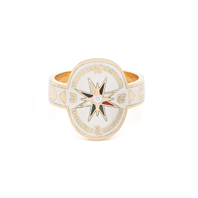 DescriptionHandcrafted in 18k yellow gold, our Internal Compass Cigar Band is fused with cream enamel and symbolizes the Internal Compass. All change starts within and then radiates outward. The Compass symbolizes the belief that life is a continual proces
