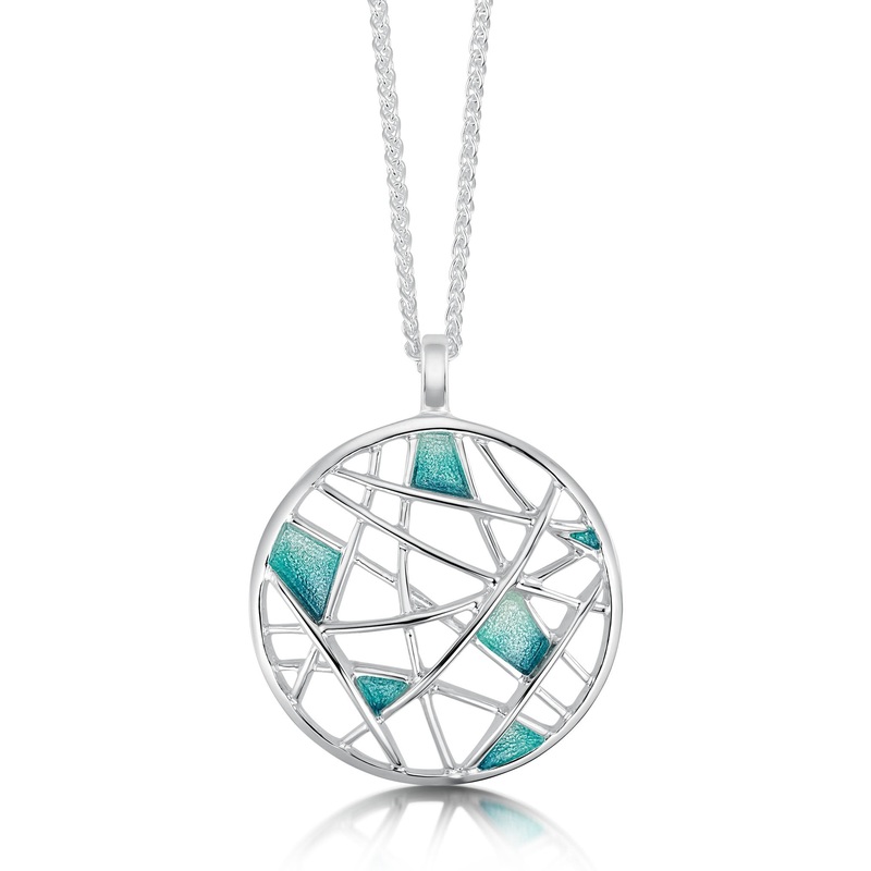 This enamelled sterling silver Creel Pendant Necklace mimics the pattern of fishermens creels. Silver strands on the front of the design combine and curve to form elegant shapes, the ‘Storm’ enamel representing trapped sea water. The piece hangs on a silver wheat chain.
