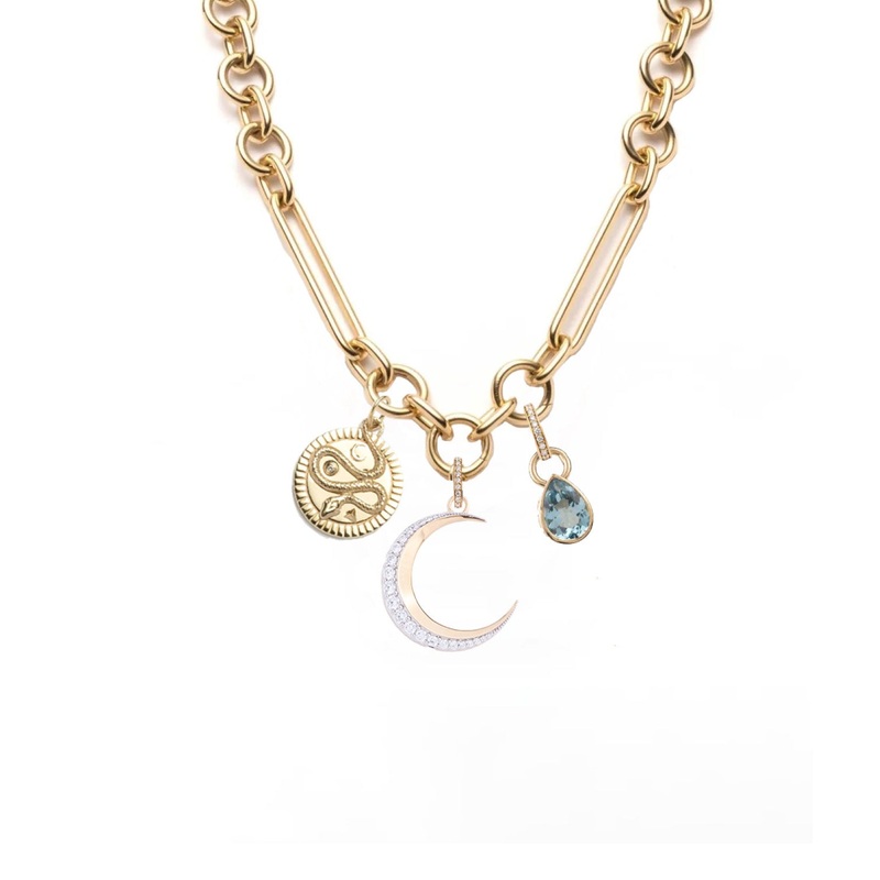 DescriptionHandcrafted in 18 karat yellow gold, this Mixed Link Chain Necklace symbolizes Karma, Wholeness, and Forever & Always a Pair. The crescent moon was chosen from the latin word "crescere," to grow. Every day is a new day to work towards truth and