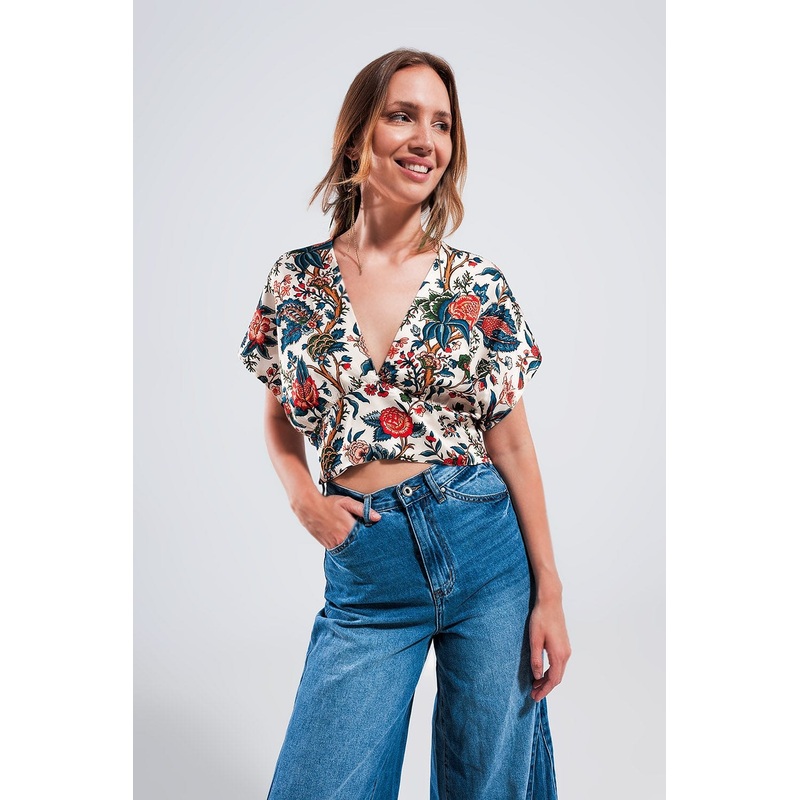 Made in Italy, this cropped-length top boasts of shiny beige paisley floral satin-style fabric, a V-neckline, a sleeveless style, and elasticated waist, dropped armholes, and a stretch-back waist. The beautiful fabric is made from 100% Viscose. In our phot
