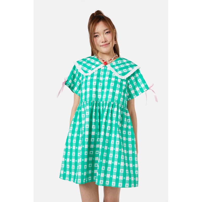 Gingham Dress -Features Custom ‘Crush On U’ Gingham -Baby Doll Style Cut -Exaggerated Collar Feature -Includes Tacked Bow Detail On The End Of Sleeve -Made From Cotton -Available In Green