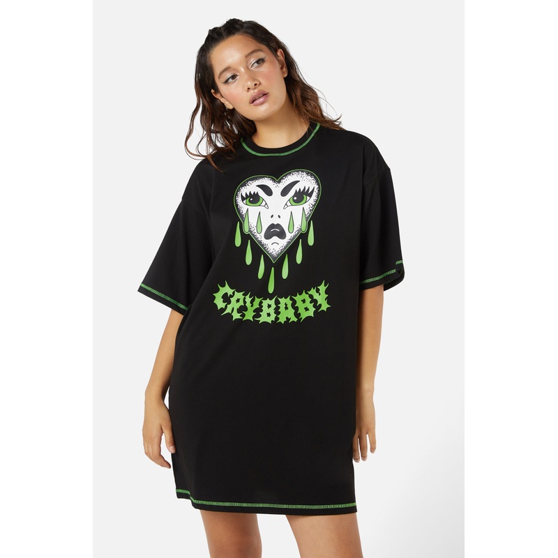 Graphic Tshirt Dress-Oversized Fitting Tshirt Style Dress-Features 'Cry Baby' Graphic-Thick Contrast Top Stitch Details-Made From Cotton-Available In BlackProduct Code: DGFW196