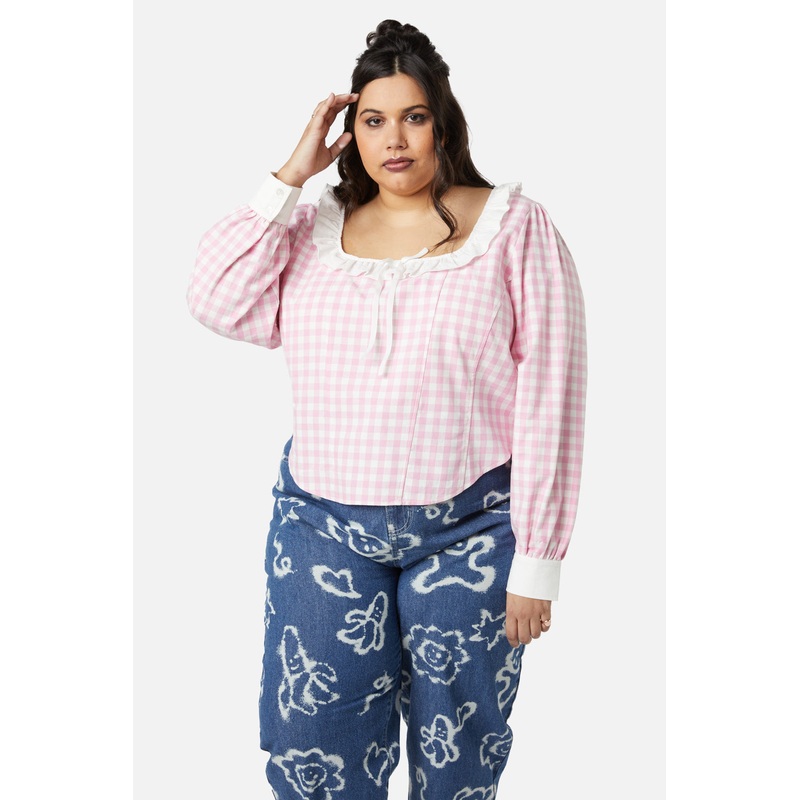 Pink Corset – Long, Puffy Sleeves – Fitted Style – Frill Detail At Neck – Fitted Cuffs At Sleeve Hems – Zip Closure – Curve Sizing – Made From Cotton – Available In Pink