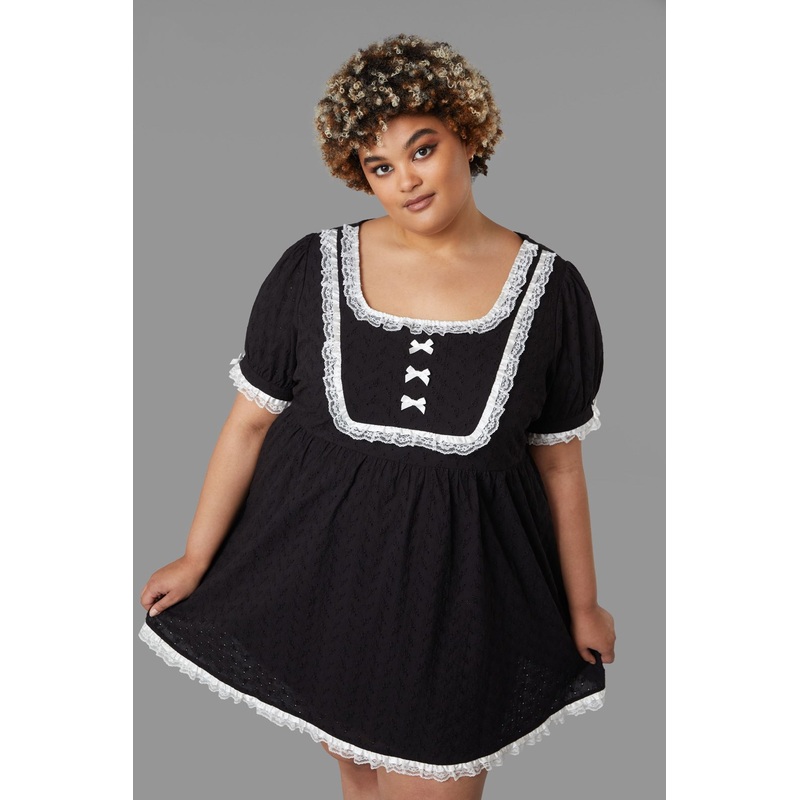 Maid Style Puffy Dress-Gathered Sleeves-Features Faux Bib Detail-Wide Circle Skirt-Includes Bow Detailing-Made From Cotton Elastane Blend-Available In BlackProduct Code: BGFW822