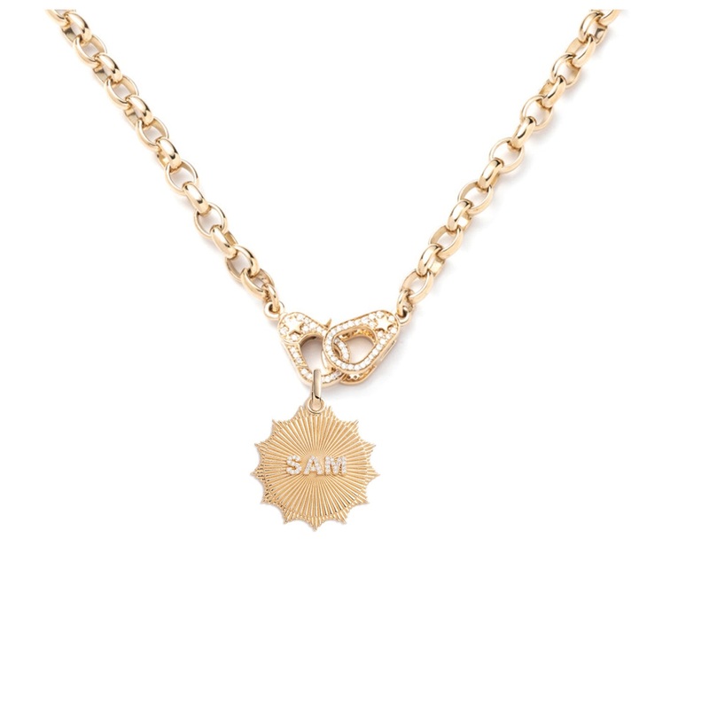 Handcrafted in 18-karat Yellow Gold, this Heavy Belcher Pave Sister Hook with our Custom Centered Clean Edge Medallion can be personalized with up to 6 letters that can be centered to the middle of the medallion. The medallion is linked to our Sister Hook necklace that is composed of our heavy belcher chain. Anchoring the chain are pave sister hooks that fit perfectly intertwined with each other.