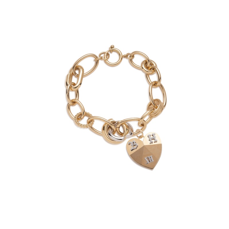 DescriptionHandcrafted in 18-karat Yellow and White Gold, the Menagerie Chain Bracelet is paired with our Facets of Love Heart Medallion and includes five different styles of chains as well as two Tenet links the Strong Heart link, ending and beginning wit