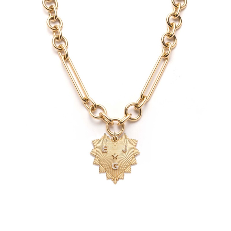 Handcrafted in 18-karat yellow gold, this 18″ Oversized Clip Chain with an Oversized Heart Love Token has 3 center annex links to add the medallions of your choice. . Surrounded by pave diamond letters, the oversized love token celebrates the seven classic types of love as defined thousands of years ago: