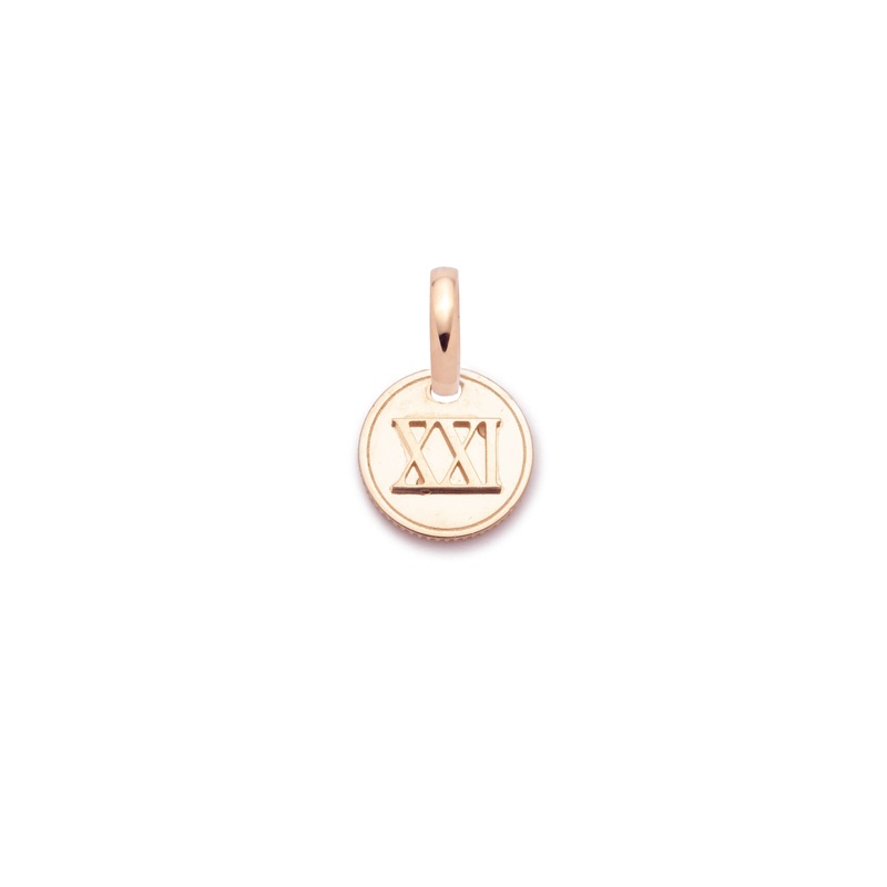 DescriptionThe 18-karat Rose Gold mini coin medallion has a three-dimensional roman numeral at its center. A number of your choice to commemorate a special year, birthday, or memory. Tools to tell your story. Comes with an ovalpush gateas a tool to build a