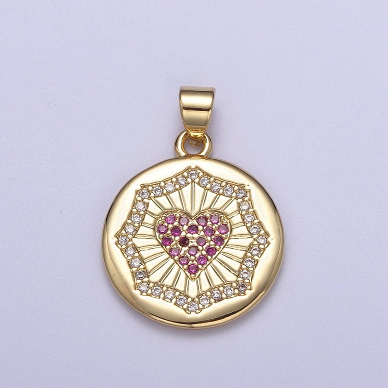 Dainty Gold Round Coin Pendant with Micro Pave Heart Charm H-543