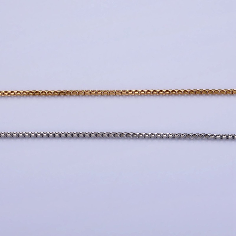 Material: Stainless SteelTone: Stainless SteelSize: 1.2mm on ChainTheme: Box Chain, Cable Chain, Rolo Chain