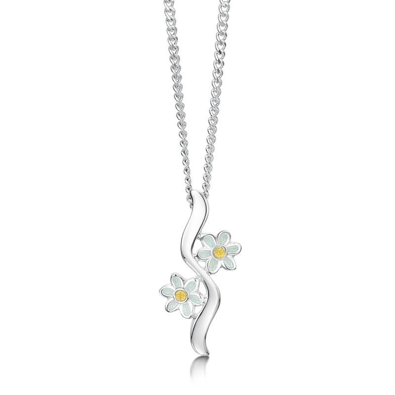 This sterling silver Daisies at Dawn pendant necklace features two small daisies, each hand-enamelled in Sunshine enamel. The pendant measures approximately 23mm in length and drops elegantly from a silver chain.