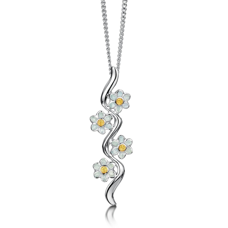 This Daisies at Dawn pendant necklace features four small daisies, each hand-enamelled in Sunshine enamel in our Orkney workshop. The pendant measures approximately 34mm in length and delicately drops from a silver chain.All of Sheilas Daisies collections,