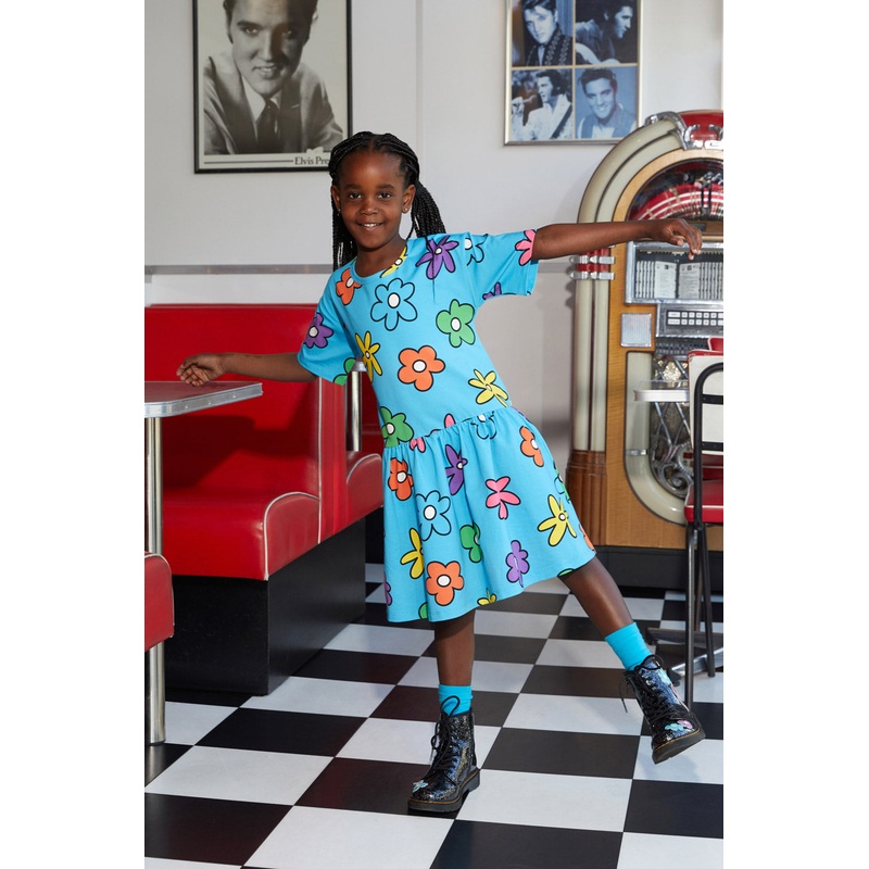 printed cotton relaxed fit dress - cotton elastane stretchy fabrication- short sleeve length- finishes at knee length - soft gathers at dropped waist seam- short sleeve length - rounded neckline- features exclusive kids print Product Code: DKGW039