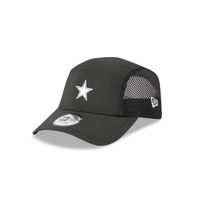 The Dallas Cowboys Black Poly Runner Cap features a heat sealed Cowboys logo at the front panels with mesh side panels. Additional details include a silicone patch above an adjustable drawstring closure at the rear.