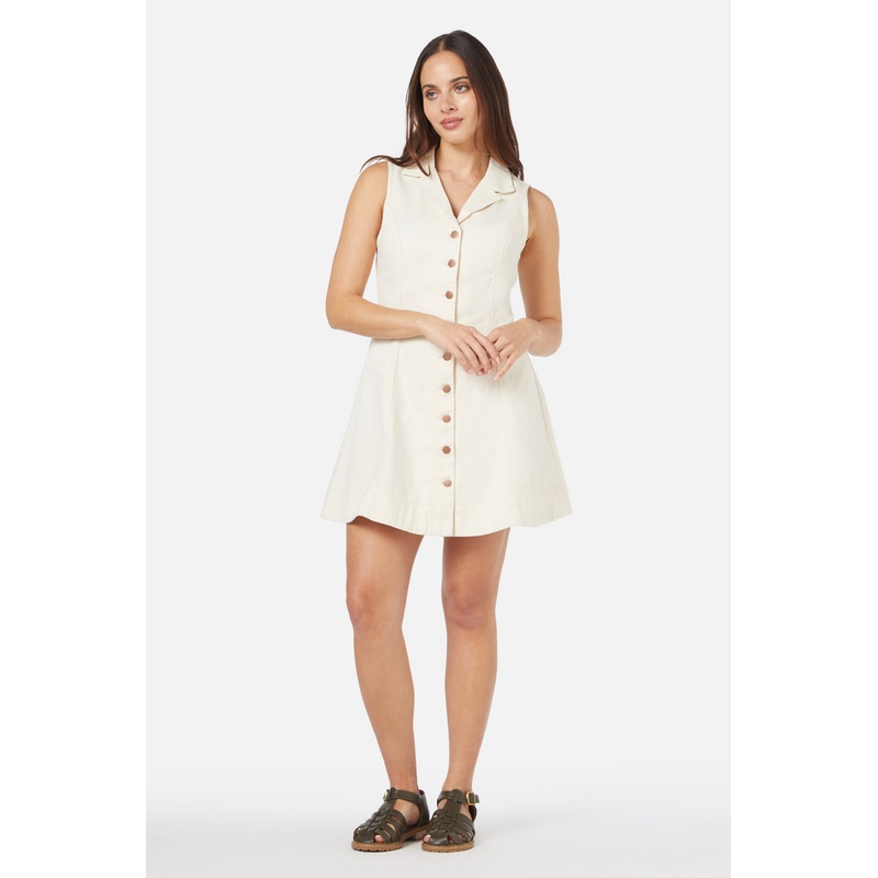 White cotton denim sleeveless mini dress, with button front, pointed collar & flared skirt. A casual transeasonal style for spring- copper styled button through front - classic pointed collar - mini length with flared shaped skirt - back adjustable slider