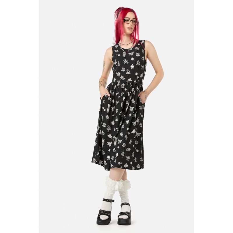Graphic Printed Dress-Features 'Darc' All Over Custom Print-Long Length Fit & Flare-Has Centre Back Zipper-Sleeveless Cut-Rounded Neckline-Made From Viscose-Available In Black Product Code: BGFZ112
