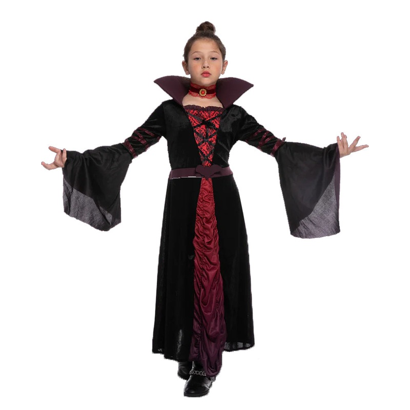 Become the princess of all Vampires in this stunning Dark Vampire Princess Kids Costume. The costume comes as a long black velvet dress with bell sleeves and features a red center panel with criss-cross detail on the bodice. The dress is designed with dark purple trimming at the elbows neckline and has a matching purple stand up collar and belt with bat motif. Perfect for vampire parties or Halloween! Get more than one use out of this dress and wear it without the bat belt to transform into an evil fairytale Queen for Book Week.