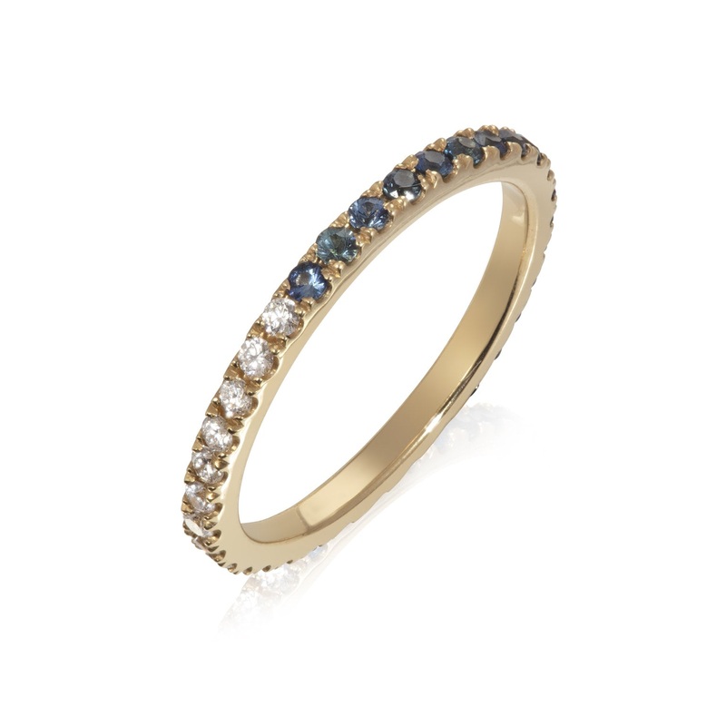 In The Dawk and Dusk Ring, day meets night with this special eternity ring. Australian blue sapphires sit next to CanadaMark diamonds for an awesome contrast in colour.Wear with the blue facing forwards, the diamonds, or a mix of both - perfect for those w