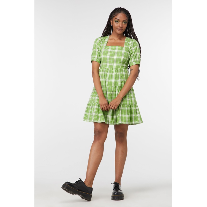 Gingham Dress- Short, Puffy Sleeves- Tiered Skirt- Bust And Waist Darts- Tie At Back Neck- Low Cut Back Shape- Made From Organic Cotton- Available In GreenProduct Code: DGFU207005